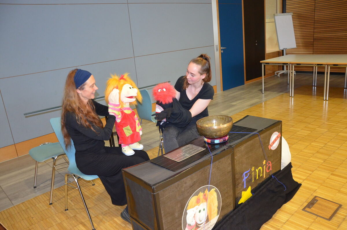 Zum zweiten Mal präsentierten Stefanie und Maya Braun dem jungen Publikum im Ferienprogramm das Theaterstück mit der Hauptfigur Finja Funkelschein. Finja ist eine schüchterne Grundschülerin, die vom fiesen Brutus aus der vierten Klasse ständig geärgert wird. Sie ist aber leider viel zu schüchtern, um dem Fiesling zu zeigen, dass sie das nicht möchte. Zum Glück trifft sie auf Professor Neinstein, der sie in der fantastiologischen Wissenschaft des Nein-Sagens unterrichtet. Fortan ist Finja seine Assistentin und hilft anderen Kindern, sich in Konfliktsituationen selbst zu behaupten.