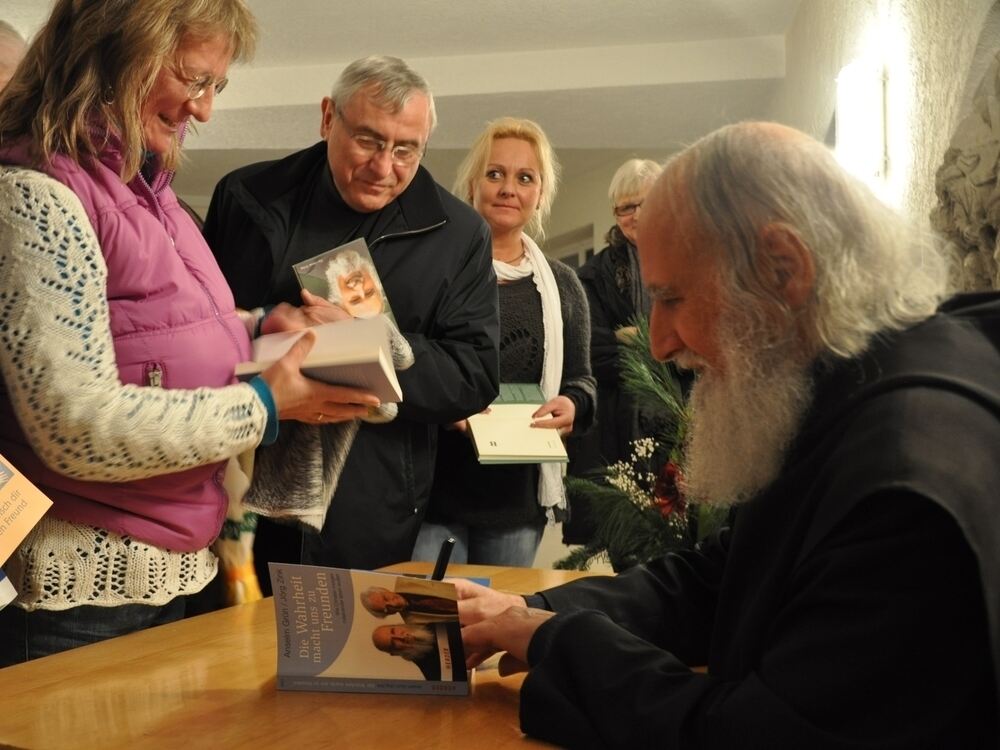 Der Andrang war groß: Nach seinem Vortrag musste Pater Anselm Grün in Eningen viele Bücher signieren. FOTO: SEITZ