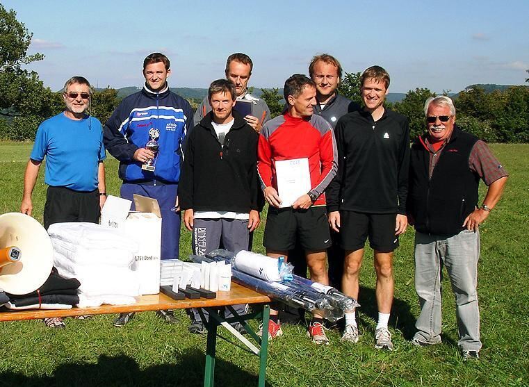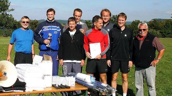 Faustballsieger (von links): Roland Zeeb, Christoph Haltenhof, Uli Glaser, Volker Bertsch, Joachim Roth, Jörg Schönenborn, Martin Hehn, Horst Döpper (Pokalstifter). FOTO: PR