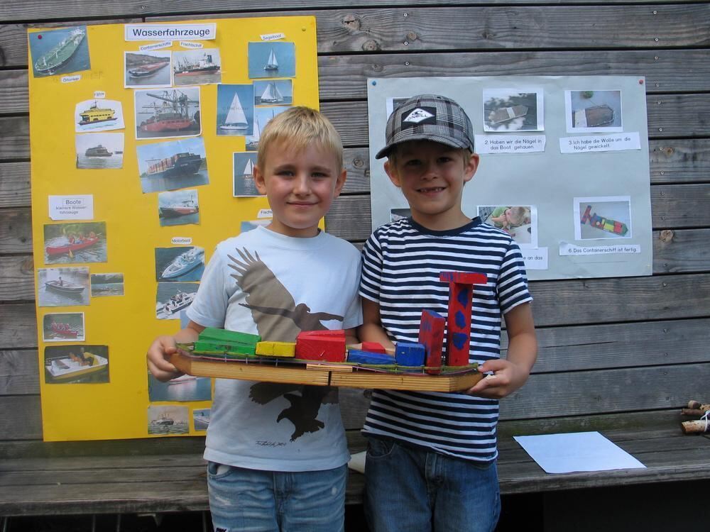 Timon und Benedikt präsentieren ihr selbst gebautes Containerschiff. FOTO: EGENBERGER
