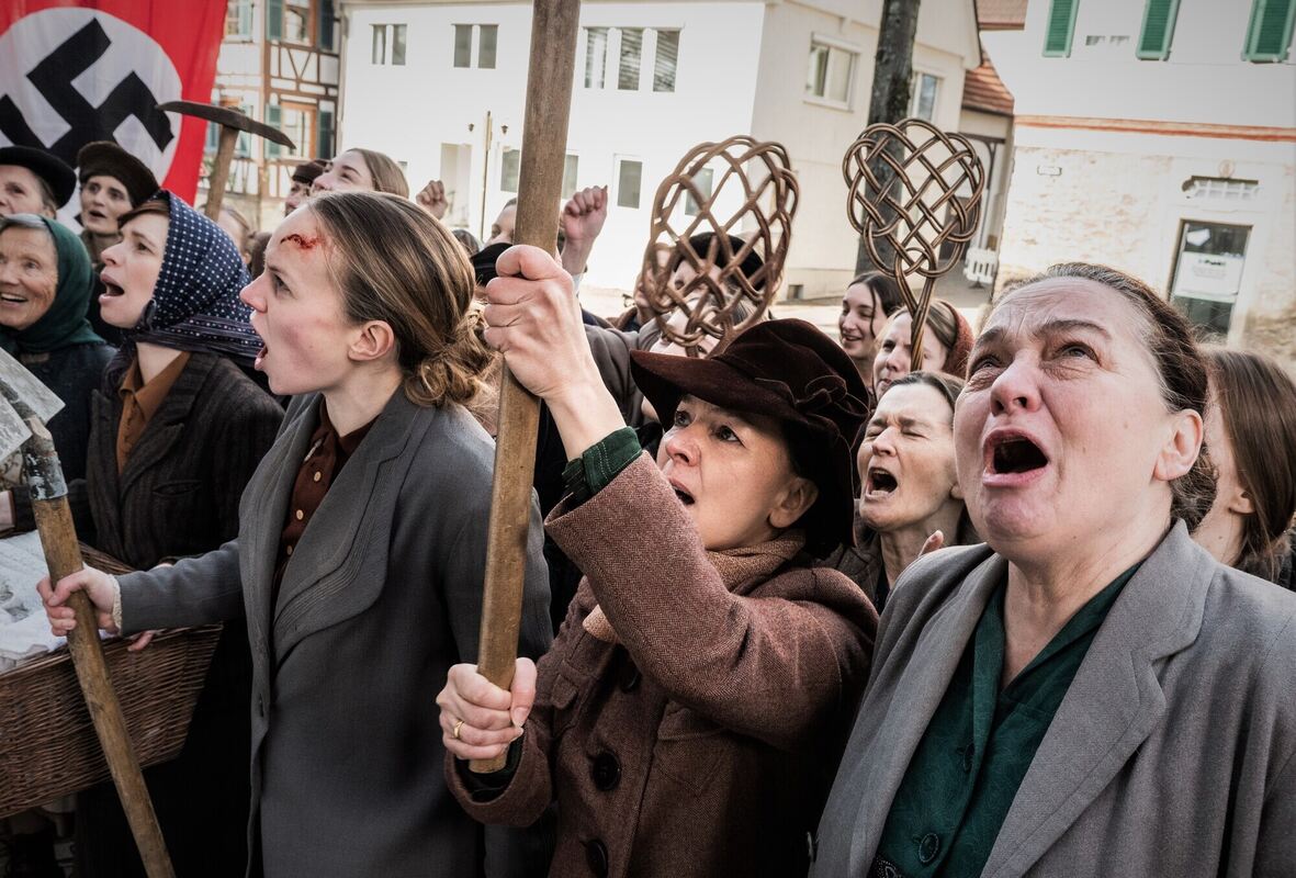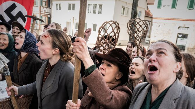 Pfullinger Frauen fordern Kampfkommandant Julius Kieß lautstark auf, aus dem Rathaus zu kommen. So wird es im Dokudrama »Unbekannte Helden« dargestellt, das demnächst im SWR-Fernsehen zu sehen ist. FOTO: BERNKLAU