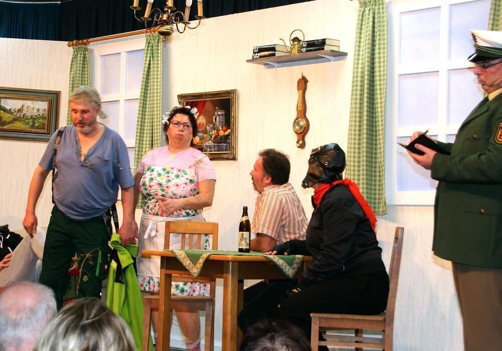 Turbulente Komödie auf der Bühne im Honauer Gemeindehaus: Carmen Henker (von links), Aline Werner, David Epple, Thomas Biffart, Carmen Epple, Jürgen Reiff, Bettina Werner und Thomas Epple präsentieren den Dreiakter »Pappadeckel« von Maria Herth. FOTO: LEIPPERT