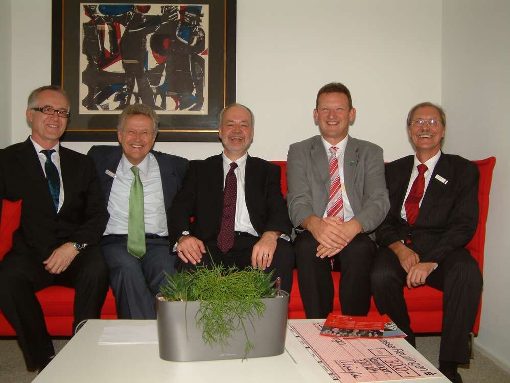 Machten es sich auf dem roten Sofa in der Ruhe-/Sitzzone des Foyers gemütlich (von links): Architekt Helmut Hirth (Büro Hank + Hirth), KSK-Vorstandsvorsitzender Eugen Schäufele, Landrat Thomas Reumann, Bürgermeister Alexander Schweizer und Filialdirektor Eberhard Kopp.