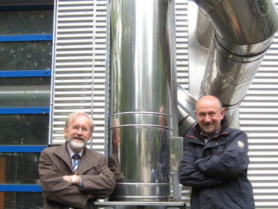 Bleiben dran am Energiesparkonzept: Pfullingens Bürgermeister Rudolf Heß, links, und Stadtwerke-Leiter Herbert Reusch vor der durchaus repräsentativen, zeitlos gestylten Holzhackschnitzel-Heizanlage im Areal der Schlossschule, die sogar Baumschnitt-Abfälle frisst.