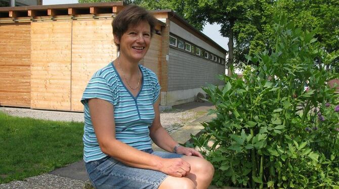 Karin Seelhorst am Beet in der Schule, mit dem alles begann.