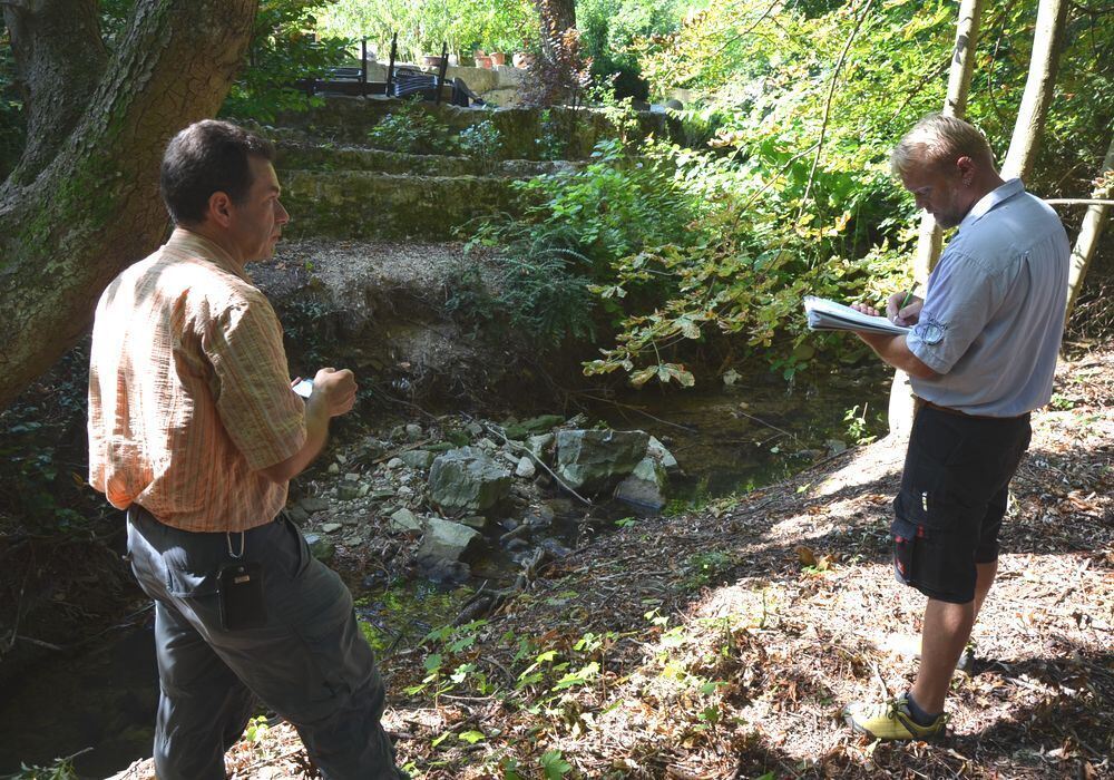 Hier am Leinsbach an versteckter Stelle ist Handlungsbedarf, hier stürzt das Ufer ab, stellen Rainer Klett und Jens Herold (von links) fest.