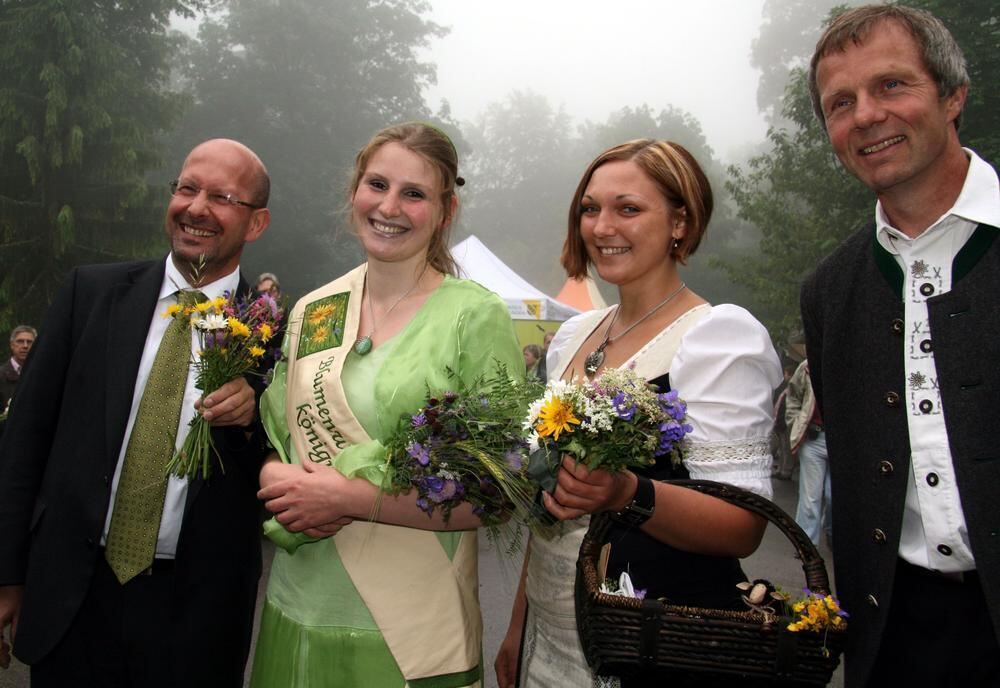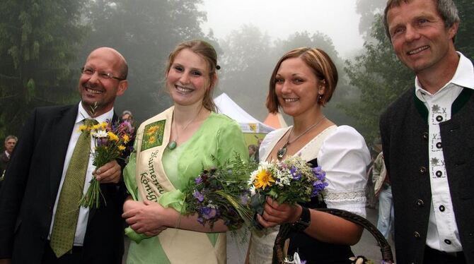 Hoheiten und Tross (von links): Thomas Berrer, Ministerialrat vom Ministerium für Ländlichen Raum, Ernährung und Verbraucherschutz, die neue Blumenwiesenkönigin Anja Bechthold, ihre Vorgängerin Patricia Walter und Dr. Rainer Oppermann, Vorsitzender des Vereins Blumenwiesen-Alb.
