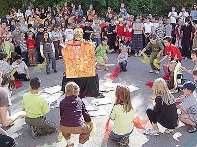 Gespannt verfolgten die Kinder auf dem Hof der Brögerschule, wie die kleine Hexe symbolisch Hexenbücher verbrannte.