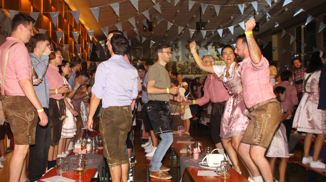 »Heut geht’s mal wieder los, s’erschte Mal nach Corona«, freute sich Vorsitzender Christoph Sautter. 2019 sei die letzte Dirndlparty gewesen. Zur Freude der Verantwortlichen umfasste die Gästeschar aber auch nach vier Jahren Pause wieder so ziemlich alle erwachsenen Altersgruppen. »Dadurch ist die Stimmung super und es gibt wenige Unstimmigkeiten, das tut unserem Fest richtig gut.« Die Karten wären in zwei Wellen über die Theke gegangen. »Wir waren schon vor vier Wochen ausverkauft, hätten aber noch viel mehr Eintrittskarten verkaufen können, wenn die Beschränkung nicht wäre«, meinte Sautter, ohne diese Begrenzung aber zu kritisieren. »Wir halten uns da gerne daran, nicht dass mal irgendwas passiert.«