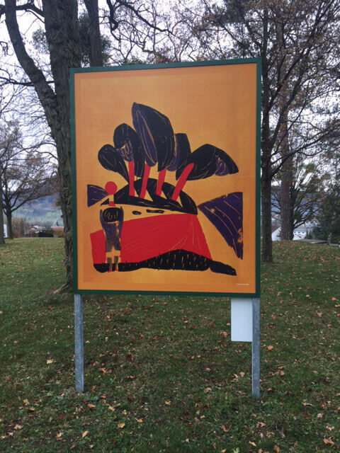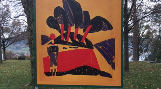 ENINGEN. Der HAP-Grieshaber-Weg wird nach und nach vervollständigt. Jetzt sind wieder zwei neue Werke dazugekommen. Auf der Eiferthöhe steht seit Anfang des Jahres die Tafel mit dem Titel »Berg«, auch »Königin Achalm« genannt. Die Rückseite wurde nun dieser Tage von der Werbewerkstatt »Pixel Gurus« ergänzt durch eine Abbildung, ebenfalls aus dem Kinderbuch »Herzauge«, mit dem Titel »Ein Wiesental geh ich hinab – Ich muss zur Schule«. Gewidmet hat Grieshaber die 1937 entstandenen Holzschnitte im Jahr 1969 später seiner Tochter Ricca in einem Kinderbuch.