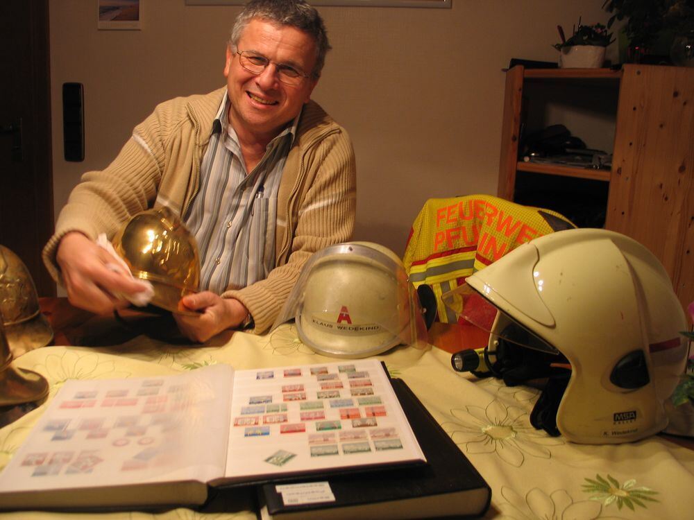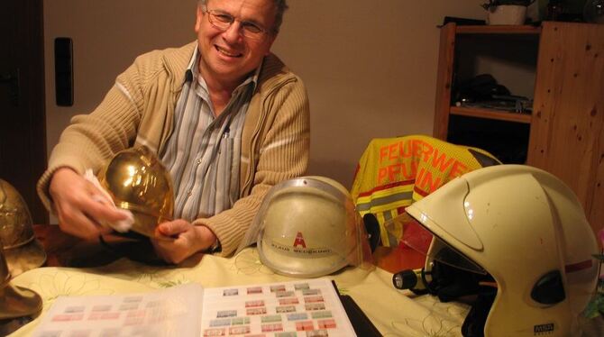 Auch außerhalb der Gruppenstunden und Einsätze für die Feuerwehr aktiv: Klaus Wedekind. Hier poliert er alte Helme aus dem 19. und 20. Jahrhundert auf und erneuert die Lederriemen.Foto: Seitz