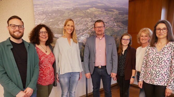 Nico Nischwitz, Regina Mayer und Heike Hein (von links) von der AWO haben ein Nachfolgeprojekt für FAWO geschaffen, darüber freuen sich Stefan Wörner, Anke Arnold, Ute Petrick und Barbara Grulke. FOTO: LEISTER