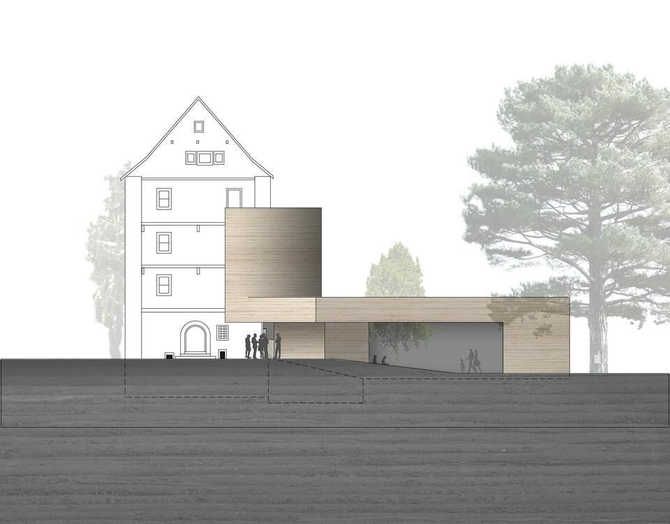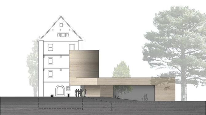 Der Entwurf des Architektenbüros Bamberg sieht einen Treppenturm an der Nordost-Ecke der Klosterkirche vor, an den sich ein Saal mit großen Fensterfronten anschließt. GRAFIK: BÜRO BAMBERG
