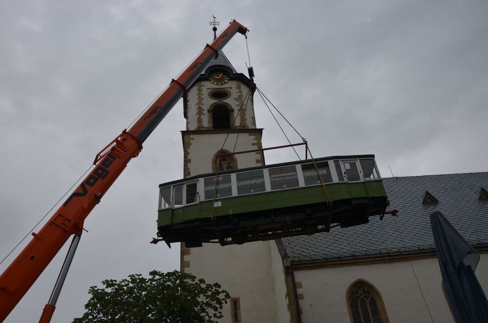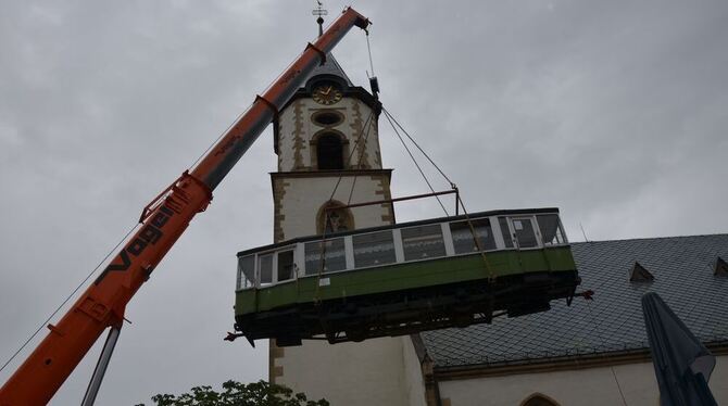 PFULLINGEN. Er ist aus Reutlingen zurück, der historische Straßenbahnwagen Nr. 40 des Pfullinger Brauchtumsvereins. Pünktlich um 10 Uhr wurde er heute vormittag vom Kran auf dem Pfullinger Marktplatz abgesetzt. Sieben Wochen lang kann die Attraktion dort »erlebt« weren: Als Cafe, Restaurant und Veranstaltungsort.