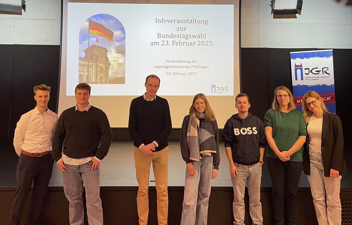 Konstantin Vogel (JGR-Vorsitzender, von links), Finn Schäfer (Jusos), Patrick Tobies (Junge Union), Eleanor Weber (Grüne Jugend), Len Brauneisen (Junge Liberale), Anne Zerr (Die Linke) und Paulina Sautter (JGR) teilten sich am Montagabend die Bühne.