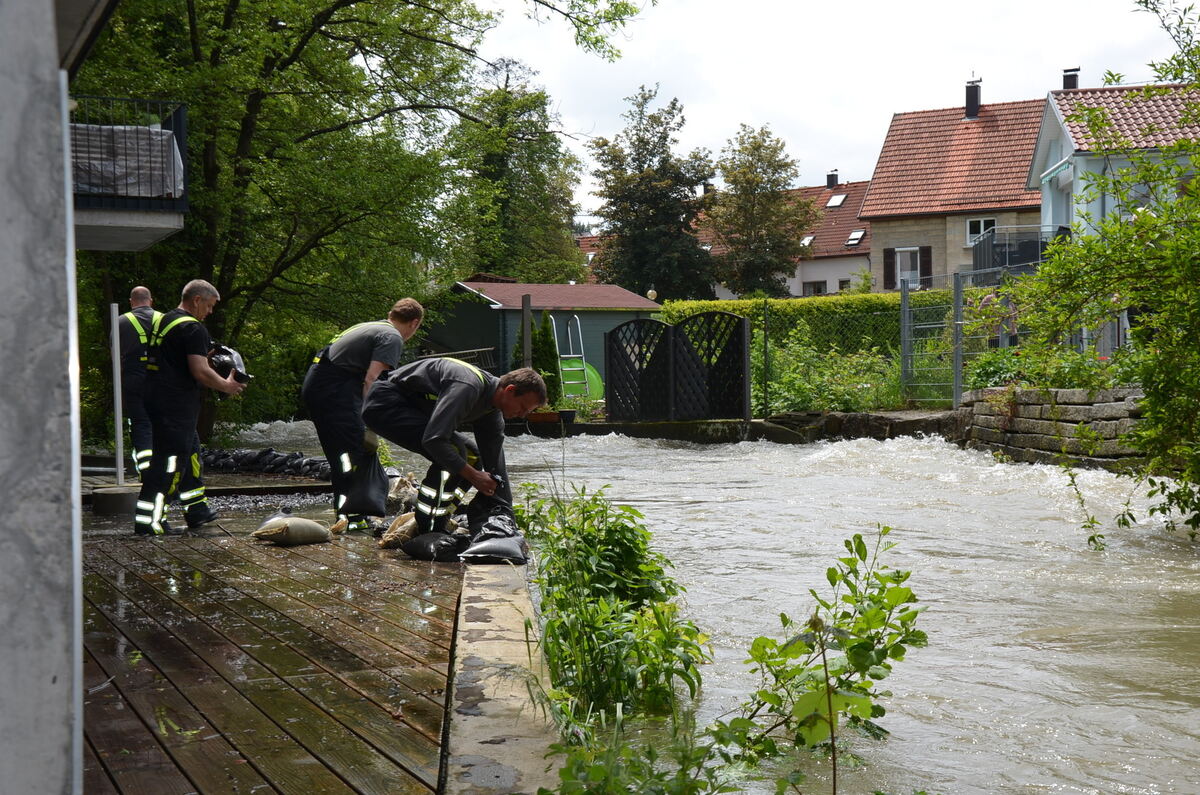 Gegen 13.30 Uhr rückte die Feuerwehr Pfullingen mit etlichen Ladungen Sandsäcken an, die Einsatzkräfte schichteten eine Barriere auf, durch die es freilich weiter hindurchsickerte. Die Eingangstür des Neubaus wurde deshalb mit einem Hochwasserschutz versehen.