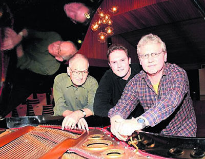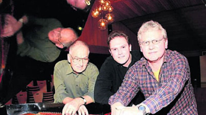 Vizedirigenten der beiden Pfullinger Gesangvereine (von links): Werner Uhlmann, Timo Zawischka (beide Eintracht) und Dieter Busch (Liederkranz) am Flügel im Musiksaal der Schloss-Schule.