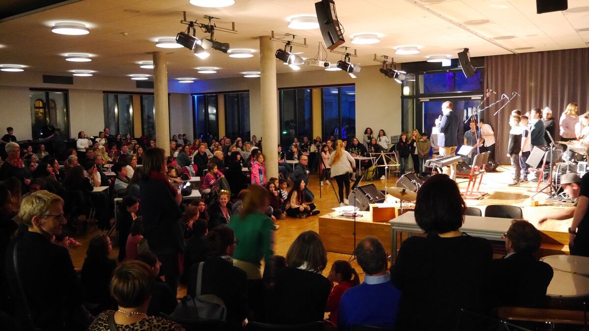 In anderen Räumen erzählten Stellwände und Tische voller Fotos, alter Zeitungsartikel und Infoschilder von der Vergangenheit der Wilhelm-Hauff-Realschule. Allen voran die Recherche und Aufbereitung von Heidrun Vetter, ihres Zeichens aktuelle Konrektorin, machten es den Gästen möglich, 50 Jahre Schulgeschichte noch einmal vor sich aufleben zu sehen – und sogar in die Hand zu nehmen, etwa in Gestalt mehr oder weniger alter Schülerzeitungsausgaben. Später versammelten sich dann die rund 300 Gäste in der rappelvollen Mensa, um Schüler wie Lehrer auf der Bühne zuzusehen. Es wurde bis weit in den Abend hinein gesungen, getanzt und musiziert. (GEA)