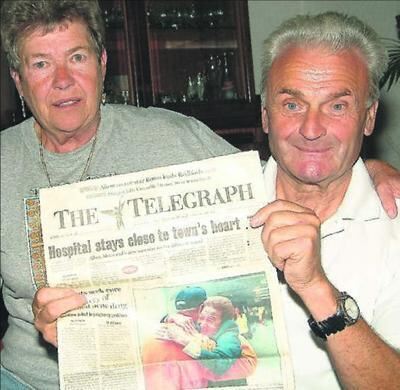 Freudentränen beim Wiedersehen mit der Schwester in den USA. Das Titelbild der Zeitung, die Karl-Heinz Krones und seine Lebensgefährtin Doris Wolf zeigen, dokumentiert die anrührende Szene auf dem Flughafen.