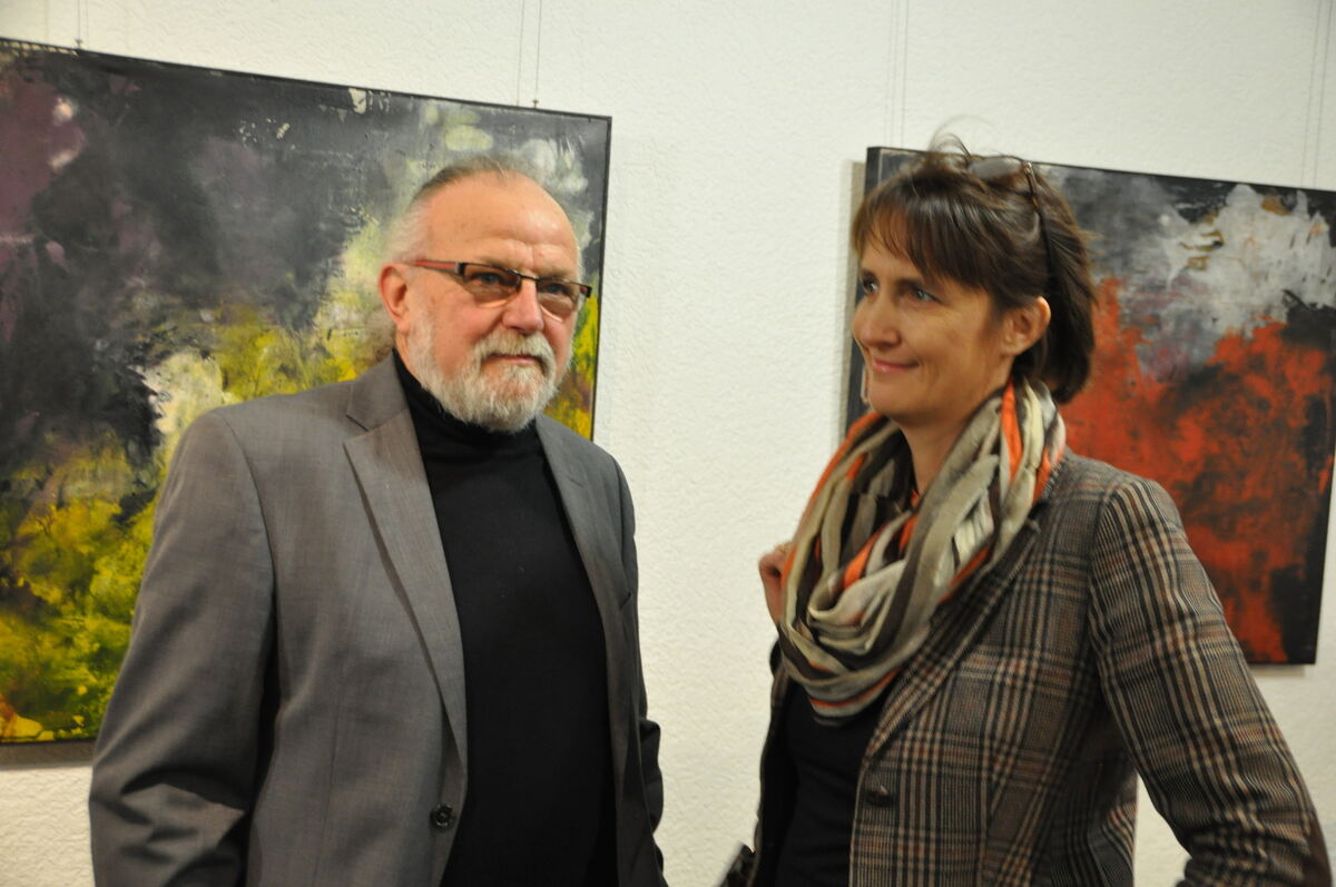 Der Pfullinger Künstler Patrice Bérard mit Kunsthistorikerin Jutta Fischer, die die Gäste der Vernissage am Donnerstagabend in seine Ausstellung »Kontraste« eingeführt hat. FOTO: BIMEK