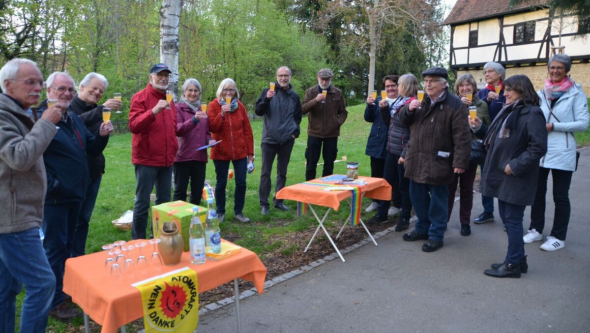 Das Abschalten der deutschen Atomkraftwerke feierten die 25 Teilnehmer des Gedenktermins bei einem Glas heimischem Streuobstwiesen-Bioapfelsaft. Seit über 35 Jahren treffen sich hier die Mitglieder des Arbeitskreises »Unser Leben« des CVJM Pfullingen am Jahrestag der Reaktor-Katastrophe von Tschernobyl.