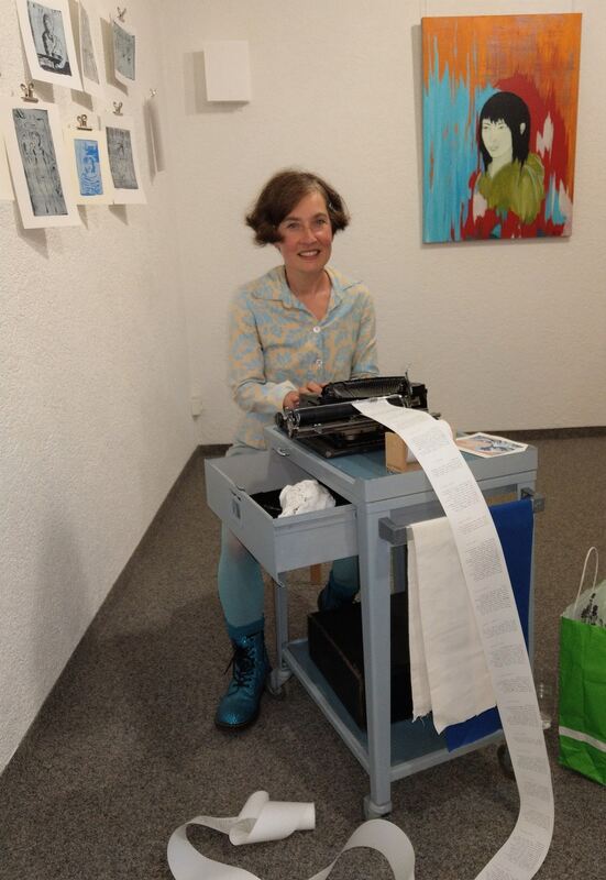 Vernissage in der Pfullinger Stadtbücherei: Die Künstlerin Christiane Haag erinnerte mit ihrer Performance an den mühsamen Akt des Schreibens vor Erfindung des PC. FOTO: BÖHM