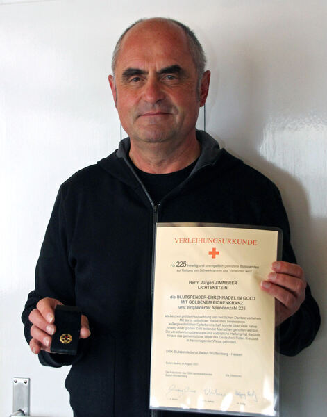 Als Blutspender sei Jürgen Zimmerer »gewissermaßen auch ein Lebensretter«, betonte Lichtensteins Bürgermeister Peter Nußbaum in seinem Dankschreiben, mit dem er »Anerkennung für diese Bereitschaft zur Blutspende« übermitteln wollte. Als kleines Dankeschön erhielt der Spender von der Gemeinde einen Gutschein, vom Blutspendedienst Baden-Württemberg die Blutspender-Ehrennadel in Gold mit goldenem Eichenkranz sowie eine Urkunde. (GEA)
