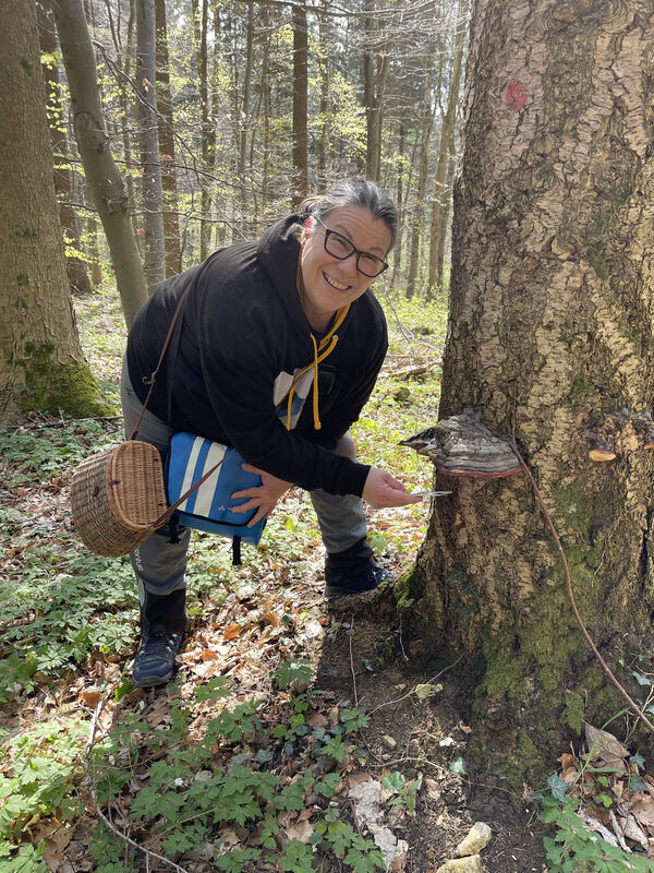 Pilzcoach Jenny Seemüller begutachtet, ausgestattet mit Pilzkorb und einem kleinen Spiegel, die feinen Poren an der Unterseite eines Rotrandigen Baumschwamms.