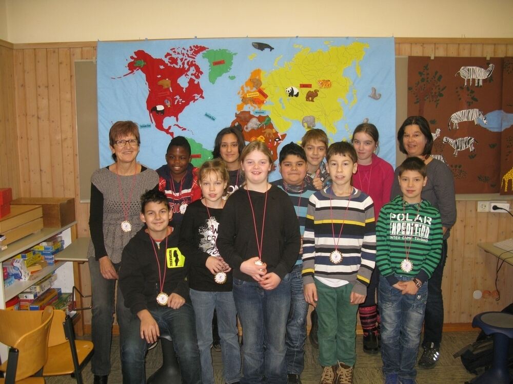 Die Lehrerinnen Sigrid Letschke (links) und Susanne Leiber-Baier (rechts) mit den Preisträgern: Max, Melinda, Florian, Patrick, Erkal, Josue, Michelle, Chantal, Jasmin, Edis und Mikey haben den ersten Preis gemacht und Goldmedaillen bekommen. FOTO: HOMOLKA
