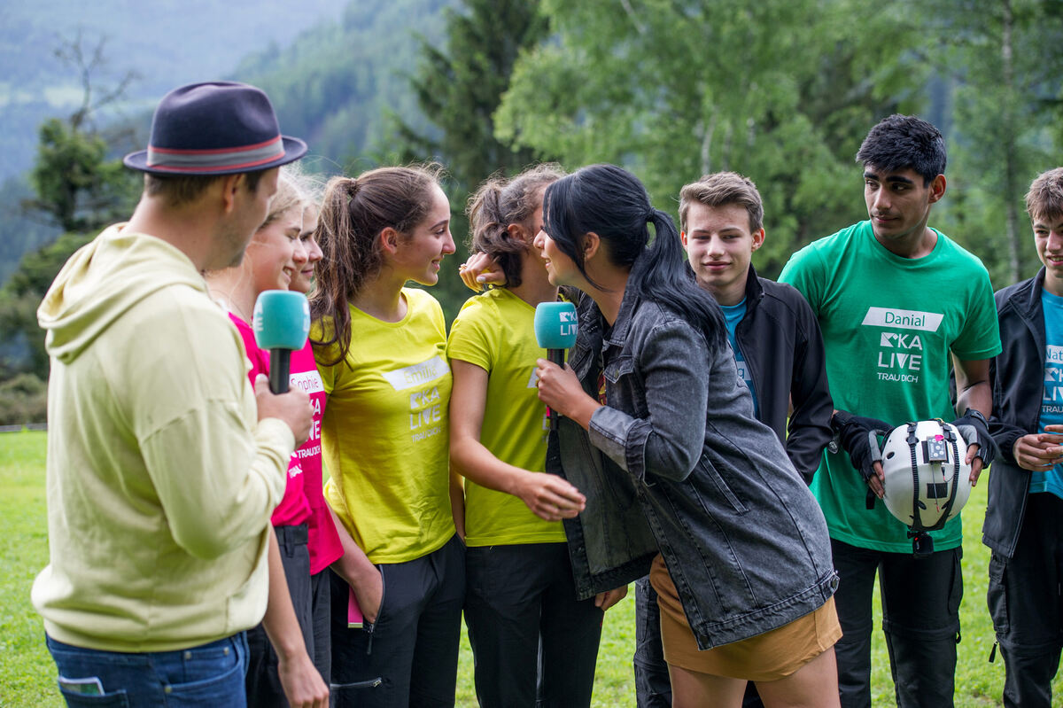 Abschied von der »Trau dich!«-Challenge: KiKa-Moderatorin Jess umarmt Lanie, links daneben Emilia. FOTO: KIKA/RON BERGMANN