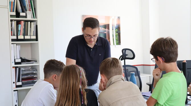 Eningens Bürgermeister Eric Sindek zeigt den Ferienprogramm-Kindern, wie ein Arbeitstag bei ihm aussieht.