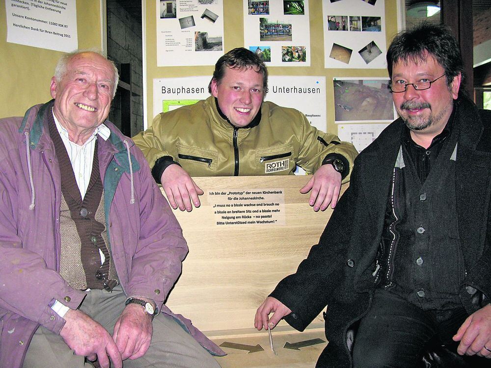 Ernst Großmann, Tobias Roth und Pfarrer Thomas Henning (von links) würden gerne noch mehr Geldscheine in der zur Spendenbox umgebauten Kirchenbank landen sehen.