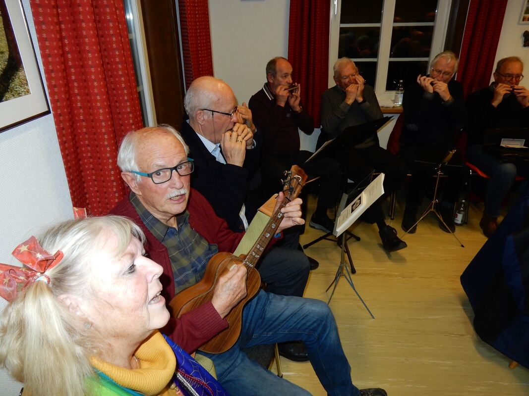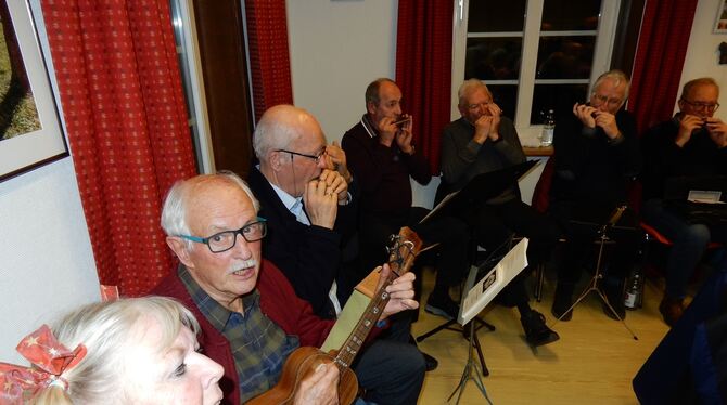 Den Abend umrahmte die Mundharmonikagruppe des Albvereins mit passenden Fasnets- und Lumpenliedern. Das Mainzer Fasnetslied »Heile Heile Gänsje« war der Auftakt. Schwäbische Liedle wie »Das arme Schulmeisterlein«, »Ritter Kurt von Ochsenwang« oder »Wir haben zu Haus nen Kleiderschrank« luden zum Mitsingen und Schunkeln ein. Die »Muha-Musiker« kamen gut an und alle freuten sich über die flotten Melodien.