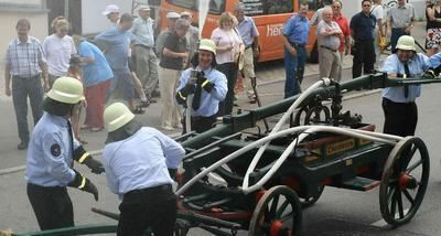 Wasser Marsch mit Muskelkraft: Die historische Spritze aus Oberstetten funktioniert einwandfrei.