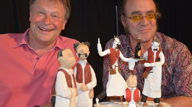 »Knobasörwiss« dreifach: Helmut Bachschuster und Matthias Knodel (von links) mit ihren Miniaturausgaben. GEA-FOTO: BARAL