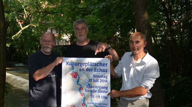 Sie haben an der Organisation des »Kulturgeplätschers an der Echaz« maßgeblich mitgewirkt (von links): Klaus Tross (Freunde der Stadtbücherei), Manfred Kober und Sieger Maier (beide i’kuh). GEA-FOTO: SCHÖBEL