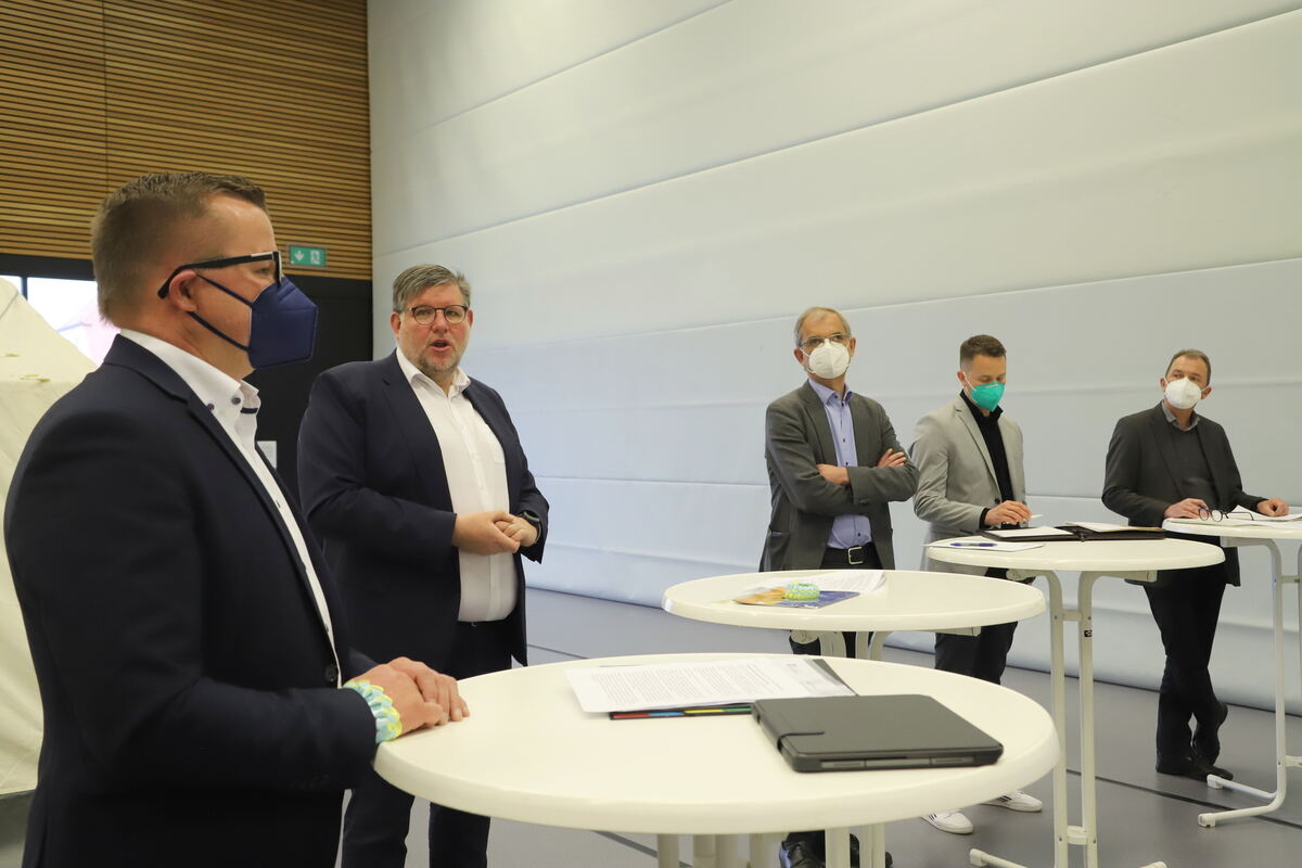 Pfullingens Bürgermeister Stefan Wörner (von links), Landrat Dr. Ulrich Fiedler, Ordnungsdezernent Dr. Claudius Müller, Jason Fritz (Abteilungsleiter Untere Aufnahmebehörde) und Sozialdezernent Andreas Bauer in der Schönberghalle.