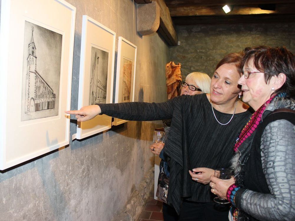 Gabriele Frey-Bantle (Mitte) erklärt Besuchern ihre Radierungen zur Ökumene in Pfullingen. FOTO: SCHEURER