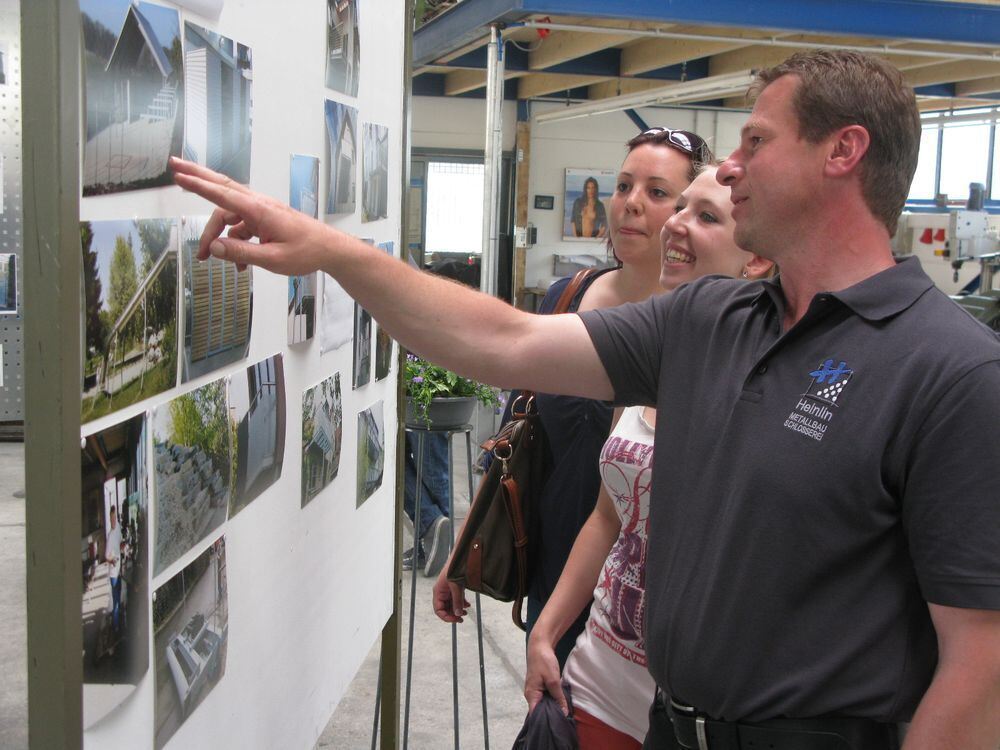 Andreas Heinlin erläutert interessierten Besucherinnen die Bilderausstellung über die Arbeiten seines Unternehmens. FOTO: SEITZ