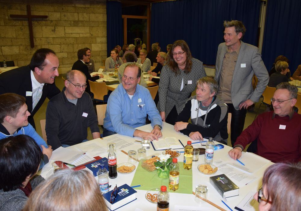 Dekan Hermann Friedl, Pfarrerin Sabine Drecoll und Pastor Oliver Lacher (von links) schauen einer Arbeitsgruppe bei der ökumenischen Kirchengemeinderatssitzung in Lichtenstein über die Schulter.