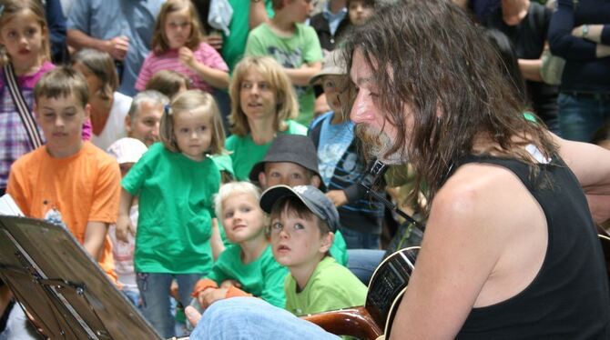 Heiner Kondschak begeistert mit seinen Liedern die Eninger Waldwichtel und ihre Eltern. FOTO: HAILFINGER