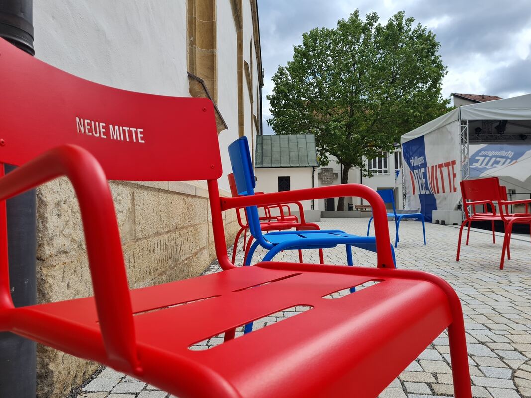 Bitte Platz nehmen: rote und blaue Stühle in Pfullingens Neuer Mitte laden zum Verweilen ein.