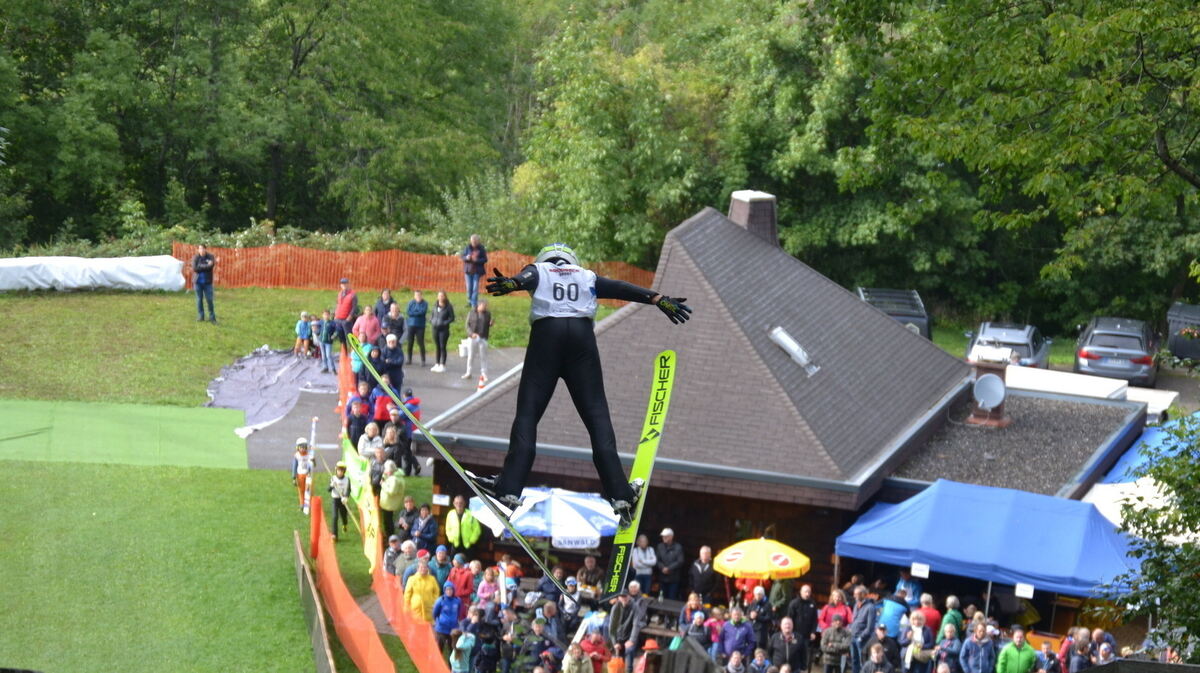 So sieht es aus, wenn im V-Stil von der großen Schanze an der Wanne gesprungen wird: Der Pfullinger Noah Künstle macht es vor.