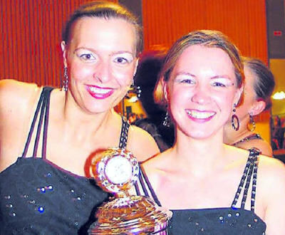Christine Abele (links) und Ulrike Schmid, zwei charmante Mitglieder der Ersten Pfullinger Standard-Formation, freuen sich über den gewonnenen Pokal.