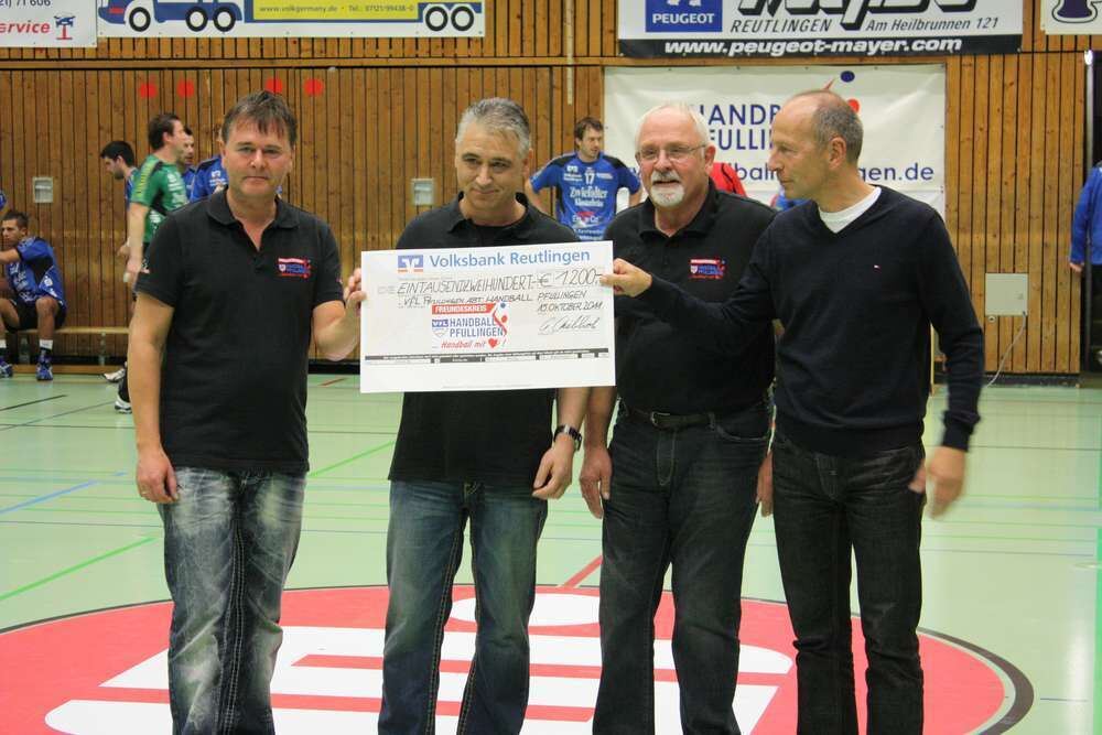 Die Freundeskreis-Vorstandsmitglieder Frank Reinhardt, Engelbert Eichholz und Ulf Tücking überreichten einen Scheck an Hans-Georg Finkbohner, Abteilungsleiter Handball und Vize-Vorsitzender des VfL Pfullingen. FOTO: GERDEMANN
