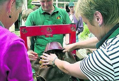 Rolf Schäfer und Frauen vom Obst- und Gartenbauverein füllen die Mostpresse mit Apfelmaische.