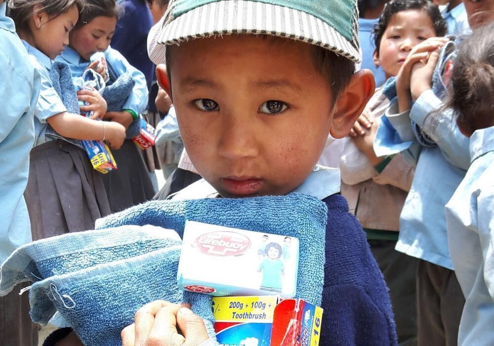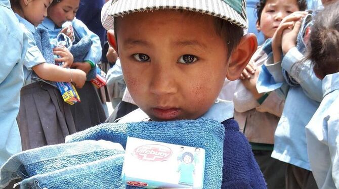Hygiene-Projekt an sieben Schulen in der nepalesischen Region Solu: Jedes Kind erhielt von Mountain Spirit ein Handtuch, ein Stofftaschentuch, zwei Stück Seife, zwei Tuben Zahnpasta und eine Zahnbürste. FOTO: PRIVAT
