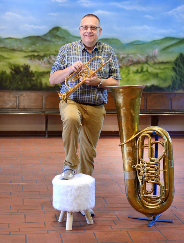 Michael Wödl hat mit neun Jahren gelernt, Trompete zu spielen. Von Kindheit an ist er der Stadtkapelle Pfullingen verbunden, spielt aber auch in anderen Ensembles. Hier posiert er vor einem Wandgemälde im Vereinsheim. FOTO: PIETH