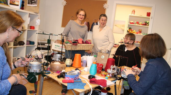 In lockerer Runde wird gestrickt und es werden Erfahrungen ausgetauscht: 14 Frauen waren auf Initiative von Monika Rosendahl (stehend links) und Daniela Körner (stehend rechts) nach Pfullingen gekommen. FOTOS: OECHSNER