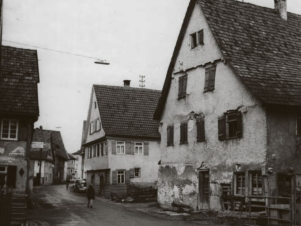 Blick durch die Schulzengasse Richtung Rathaus auf einem Foto aus den Fünfziger-Jahren. GEA-REPRO